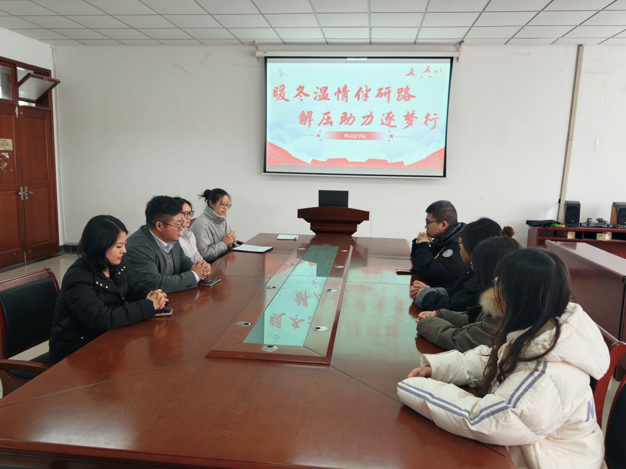 “长风破浪会有时,直挂云帆济沧海。”2026年全国硕士研究生招生初试冲刺的号角已然吹响,为帮助2022级考研学子缓解备考压力、明晰冲刺方向,外国语学院于12月4日中午在德正楼308举行了“暖冬温情伴研路,解压助力逐梦行”的考研慰问活动。学院党委副书记孙大松老师、学院学工办主任李超雅老师、2025级研究生代表以及2022级考研学生代表参加活动。