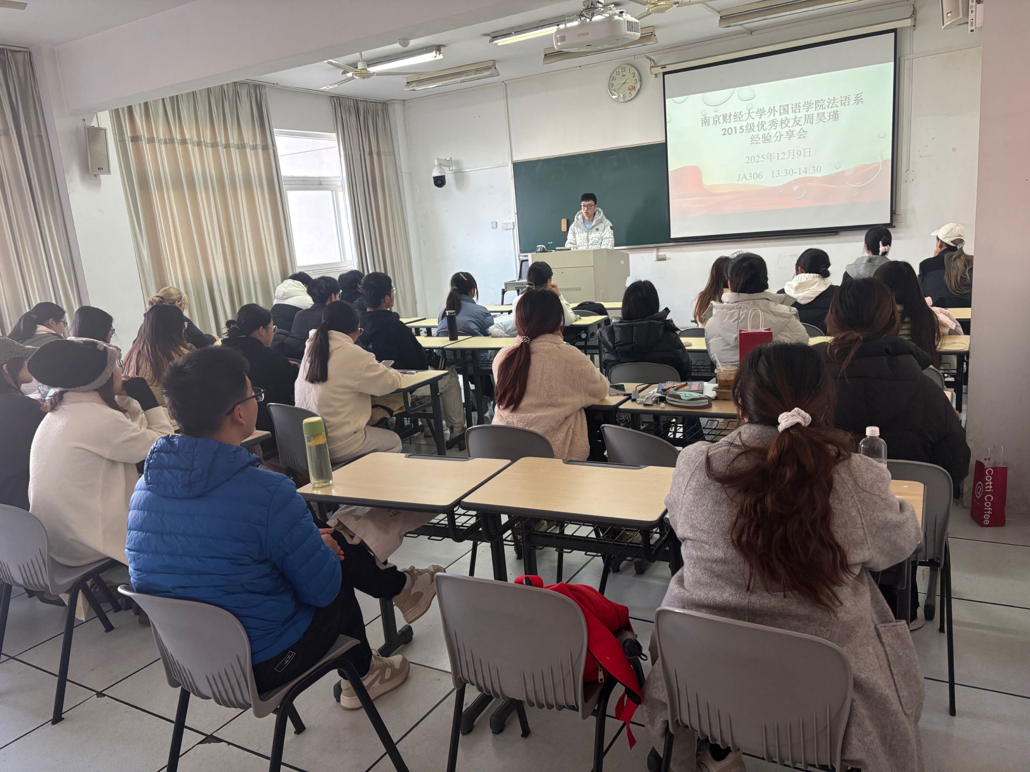 2025年12月9日下午,我院法语系在仙林校区JA306教室举办校友职业发展分享会。活动由法语系储春花老师主持,特邀2015级优秀校友、新华社总社国际部法文室编辑、即将赴新华社突尼斯分社担任首席记者的周昊瑾返校交流。法语2301级、2401级全体同学参加了此次活动。
